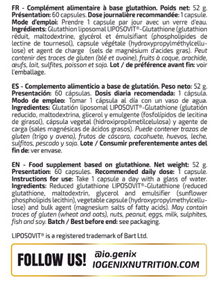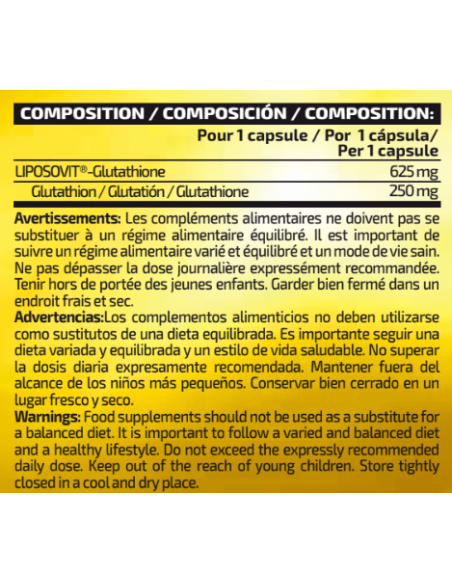 La tecnología liposomal (Liposovit®) utilizada en este producto encapsula el glutatión en fosfolípidos, una estrategia que protege el compuesto de la degradación en el tracto digestivo y facilita su transporte a nivel celular. De esta manera, se mejora su estabilidad y absorción, optimizando sus efectos en el organismo.