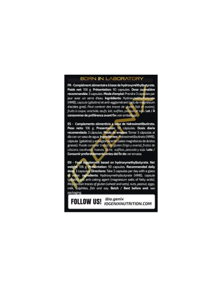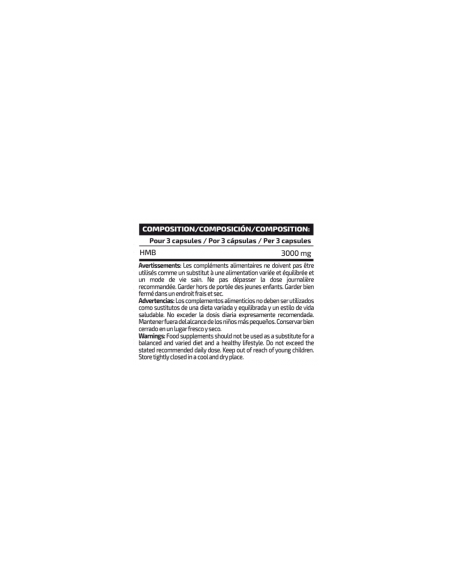 Ingredientes: Hidroximetilbutirato (HMB), agentes de recubrimiento (sulfitos (gelatina y colorantes (carbonato cálcico y octenil succinato sódico de almidón)) y antiaglomerante (estearato de magnesio). Puede contener trazas de gluten, huevos, leche, pescado y soja.