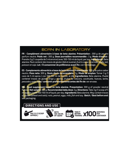 Ingredientes: Beta alanina. Puede contener trazas de gluten (trigo y avena), huevos, leche, pescado y soja.