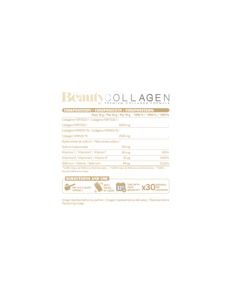 Vitamina C, vitamina D, selenio, hialuronato de sodio que van a completar la fórmula exclusiva del Beauty collagen
