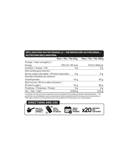 Un monosacárido utilizado por el organismo para obtener energía, perfecto para afrontar los entrenamientos más exigentes, recargando los depósitos de glucógeno.