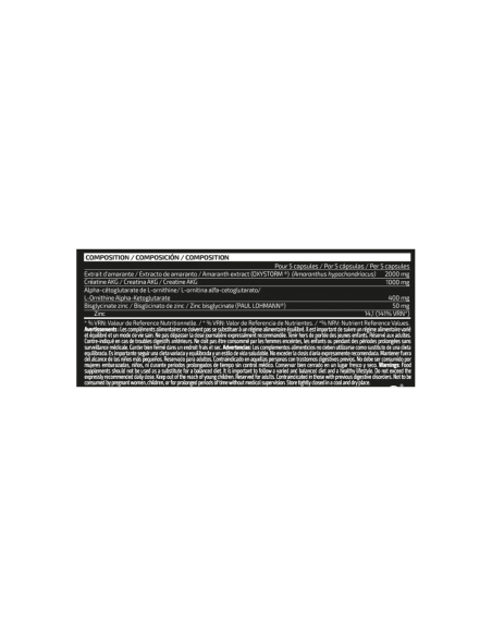 Vein OX es una fórmula compleja de efecto sinérgico a base de extracto de amaranto, creatina AKG, L-ornitina AKG y bisglicinato de zinc, compuestos seleccionados específicamente para quienes requieran una fórmula avanzada para antes del entrenamiento.
