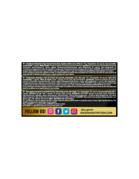Vein OX es un complemento alimenticio formulado a partir de ingredientes seleccionados minuciosamente como el extracto de amaranto OXYSTORM®, creatina AKG, L-ornitina AKG y bisglicinato de zinc de alta biodisponibilidad.
