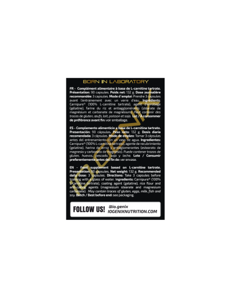 Ingredientes: Carnipure® (100% L-carnitina tartrato), agentes de recubrimiento (sulfitos) (gelatina y colorantes (carbonato cálcico y octenil succinato sódico de almidón)), harina de arroz y antiaglomerantes (estearato de magnesio y carbonato de magnesio). Puede contener trazas de gluten, huevos, pescado, soja y leche.