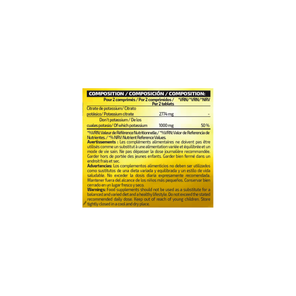 Con tan solo 2 comprimidos de citrato de potasio se obtiene 1 g de potasio (50% VRN)