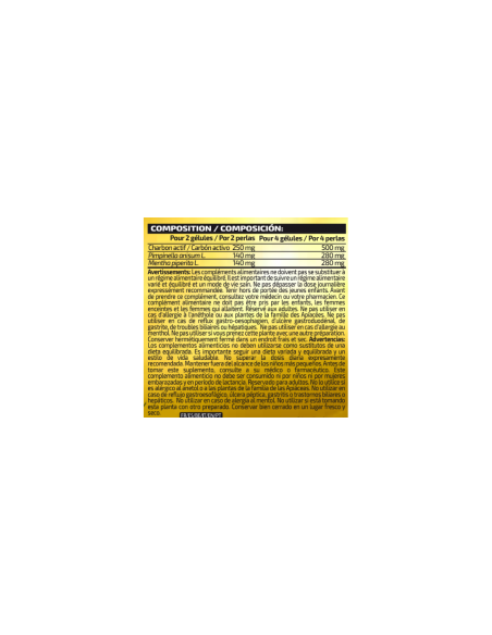 Ingredientes: Agente de carga (aceite de girasol refinado), agente de recubrimiento (gelatina y humectante (glicerina)), carbón activado, aceite esencial de anís verde (Pimpinella anisum L.), aceite esencial de menta (Mentha piperita L.), emulgente (lecitina de soja), estabilizante (grasa de soja parcialmente hidrogenada) y espesantes (silice coloidal, cera de abeja y grasa de soja hidrogenada). Puede contener trazas de gluten, huevos, leche y pescado.