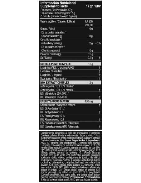 | Ingredientes: AAKG (L-arginina alfa-cetoglutarato), L-citrulina, beta-alanina, L-arginina, concentrado de raíz de remolacha en polvo 10:1 10% nitratos (Beta vulgaris L.), aroma, extracto de semilla de uva 95% OPC (vitis vinifera), cafeína anhidra, extracto seco de ginkgo 10:1 (Ginkgo biloba), extracto de ginseng 10:1 (panax ginseng), extracto seco de té verde 95% polifenoles (Camelia sinensis), acidulante (ácido cítrico), antiaglomerante (dióxido de silicio), edulcorante (sucralosa). |