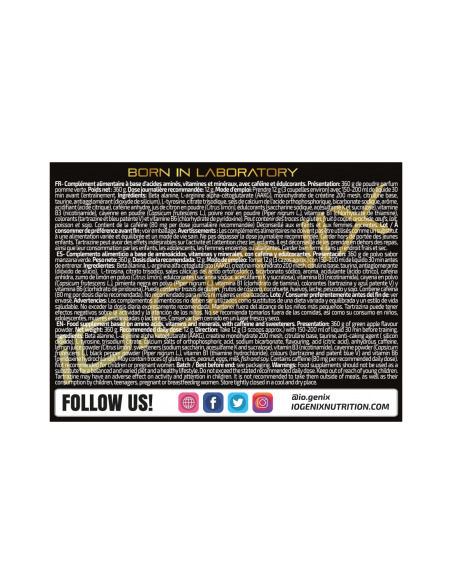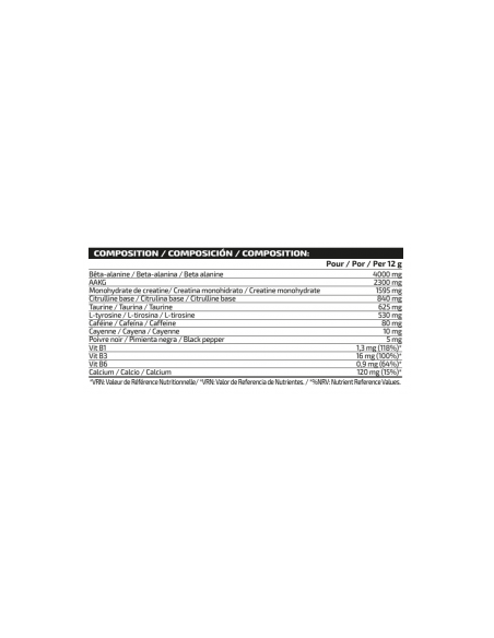 Ingredientes: Beta alanina, L-arginina alfa cetoglutarato (AAKG), citrulina base, taurina, L-tirosina, antiaglomerante (dióxido de silicio), citrato trisodico, fosfato tricalcico, bicarbonato sódico, acidulante (ácido cítrico), aroma, cafeína anhidra, edulcorantes (sacarina sódica, acesulfamo K y sucralosa), vitamina B3 (nicotinamida), cayena en polvo (Capsicum frutescens L.), pimienta negra en polvo (Piper nigrum L.), vitamina B1 (clorhidrato de tiamina) y vitamina B6 (clorhidrato de piridoxina). Puede contener trazas de gluten, huevos, leche, pescado y soja. Contiene cafeína (80 mg por dosis diaria recomendada). No recomendado para niños ni mujeres embarazadas.