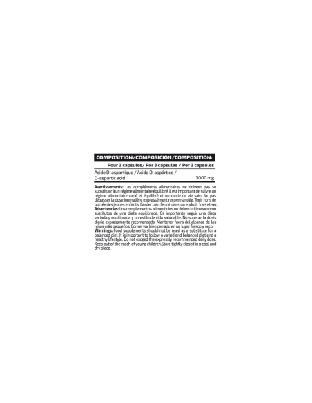 Ingredientes: Ácido D-aspártico,agentes de recubrimiento (sulfitos)(gelatina y colorantes (carbonato cálcico y octenil succinato sódico de almidón)) y antiaglomerante (estearato de magnesio). Puede contener trazas de gluten (trigo y avena), huevos, leche, pescado y soja.