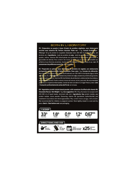 Preparado en polvo a base de aislado de proteína de vegetal, con edulcorante, enriquecido con vitamina B6. Sabor chocolate. Peso neto: 1 kg. Consejo de utilización: Mezclar 40 g del producto (2 cazos dosificadores) con líquido (agua, leche desnatada, etc.). Ingredientes: Aislado de proteína de soja, aislado de proteína de guisante, cacao en polvo, aroma, edulcorantes (sucralosa y glucósidos de steviol) y vitamina B6 (clorhidrato de pididoxina). Puede contener trazas de gluten (trigo y avena), huevos, leche y pescado.