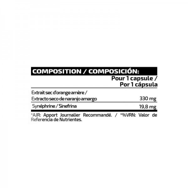 Ingredientes:Extracto seco de naranjo amargo (Citrus aurantium L., 6% sinefrina), agentes de recubrimiento (sulfitos) (gelatina y colorantes (carbonato cálcico y octenil succinato sódico de almidón)), agente de carga (celulosa microcristalina) y antiaglomerante (estearato de magnesio). Puede contener trazas de gluten, huevos, leche, pescado y soja.