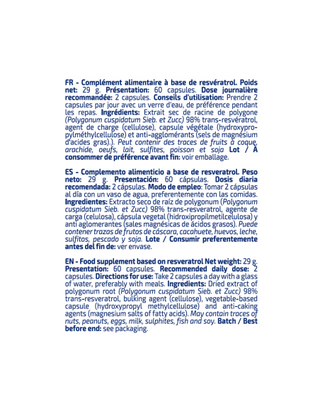 Se trata de un complemento alimenticio en cápsulas vegetales formulado con extracto seco de Polygonum cuspidatum, fuente natural de trans-resveratrol estandarizado. Una fórmula diseñada para integrarse fácilmente en la rutina diaria con materias primas vegetales de alta calidad.