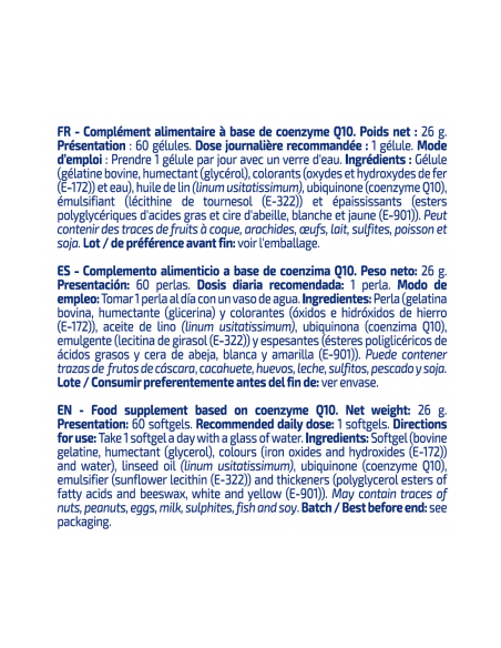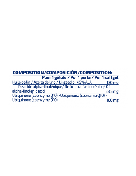 Se trata de un complemento alimenticio en perlas que aporta 100 mg de coenzima Q10 junto con 130 mg de aceite de lino, de los cuales 58,5 mg corresponden a ácido alfa-linolénico (ALA). Una formulación que facilita su uso diario en un formato práctico y estable.