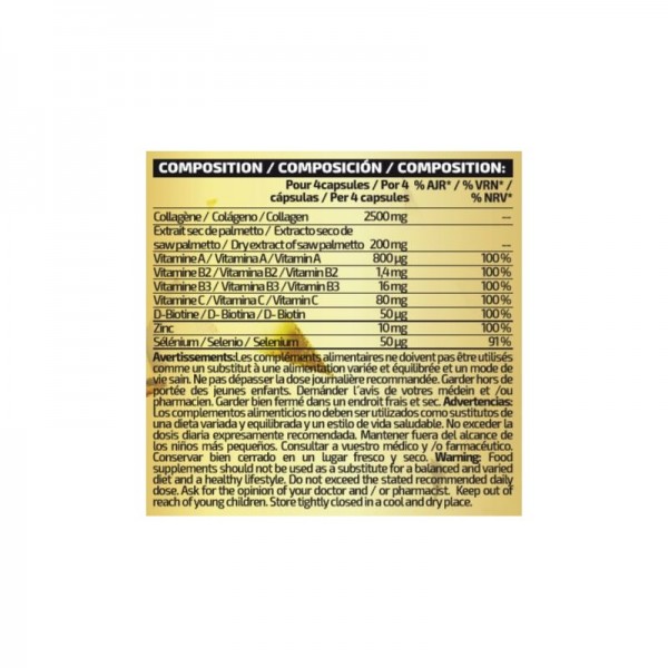 Ingredientes: colágeno Verisol®, agentes de recubrimiento (sulfitos) (gelatina y colorantes (carbonato cálcico y octenil succinato sódico de almidón)), extracto seco de saw palmetto (Serenoa Repens), agente de carga (celulosa microcristalina), vitamina C (ácido L-ascórbico), picolinato de zinc, antiaglomerante (dióxido de silicio), Vitamina B3 (nicotinamida), vitamina A (Acetato de retinilo), vitamina B2 (riboflavina), D-Biotina y selenito sódico.