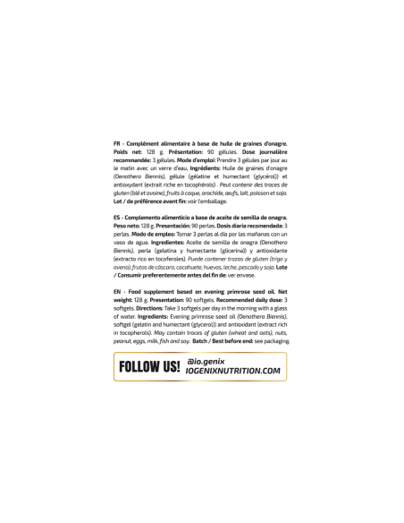 Ingredientes: Aceite de semilla de onagra (Oenothera Biennis), agentes de recubrimiento (gelatina, glicerina y agua). Puede contener trazas de gluten, huevos, leche, pescado y soja.